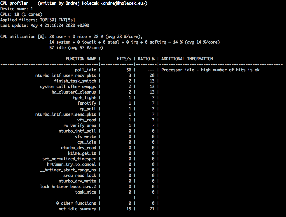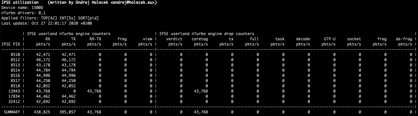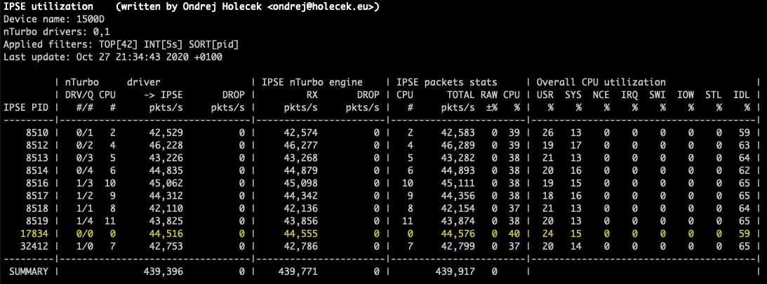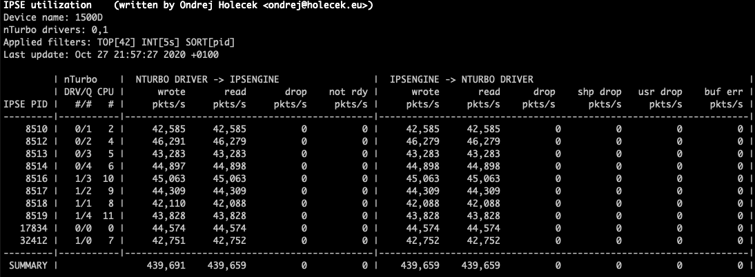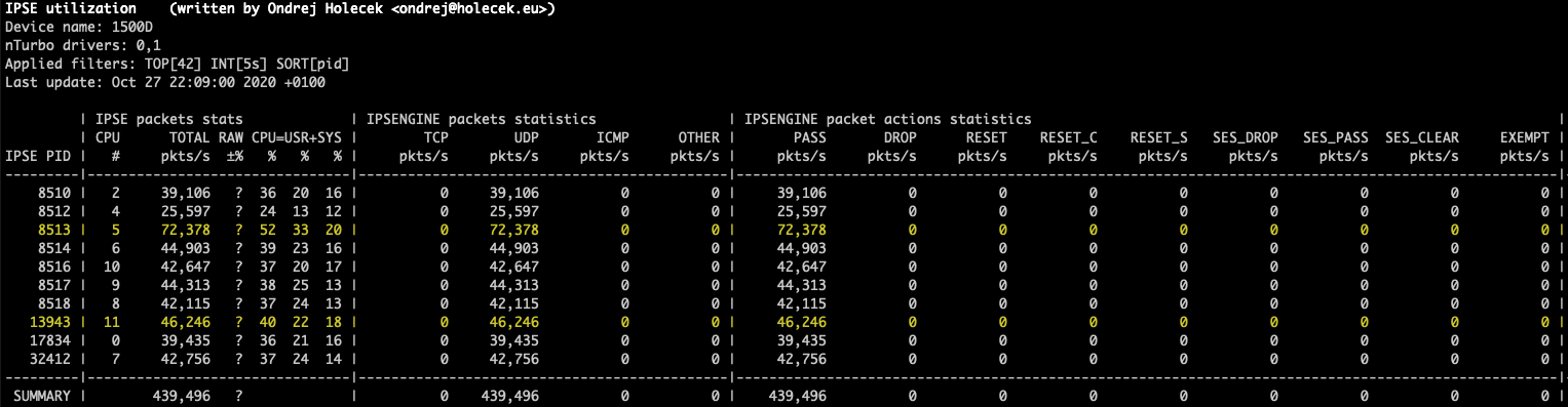 - --no-cpuDo not show overall CPU utilization section. This is hidden automatically when only userland ipsengine nturbo counters are shown, because in that case the CPU id is not collected.