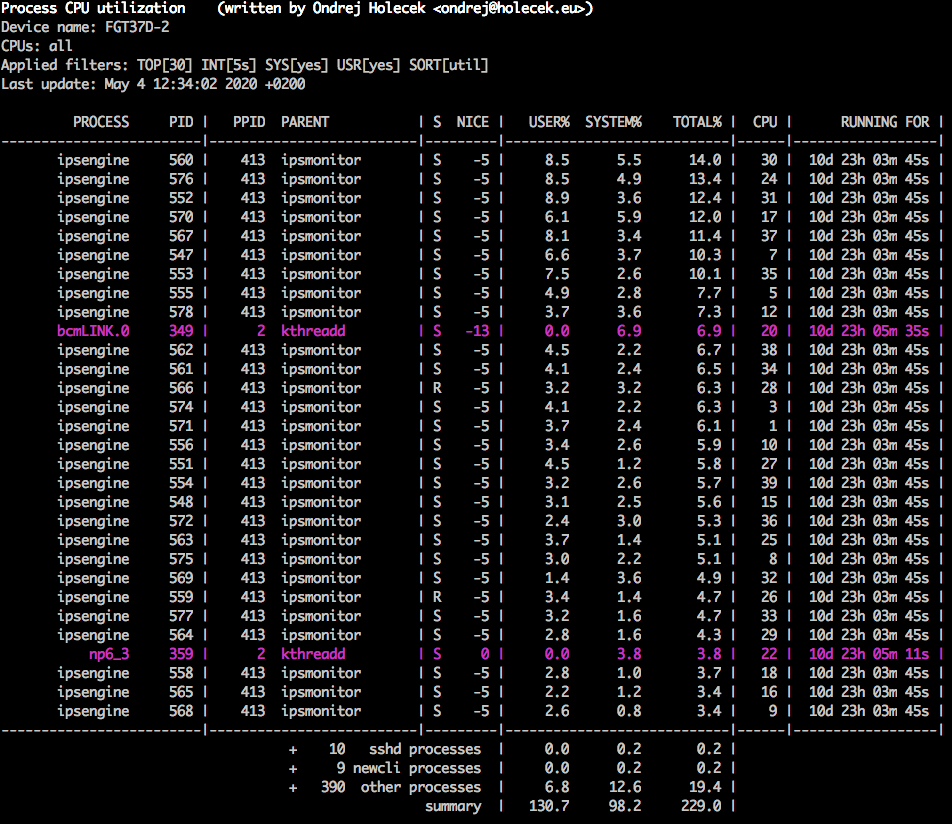 - CPUis the last CPU (core) the process was running on. There are some processes in FortiOS that are bound to one specific core and those will always show the same CPU (example of such process would be- ipsengine). However, most of the processes do not have a specific CPU assigned and they can run anywhere the system decides to - for those processes the- CPUmight be changing with every refresh.