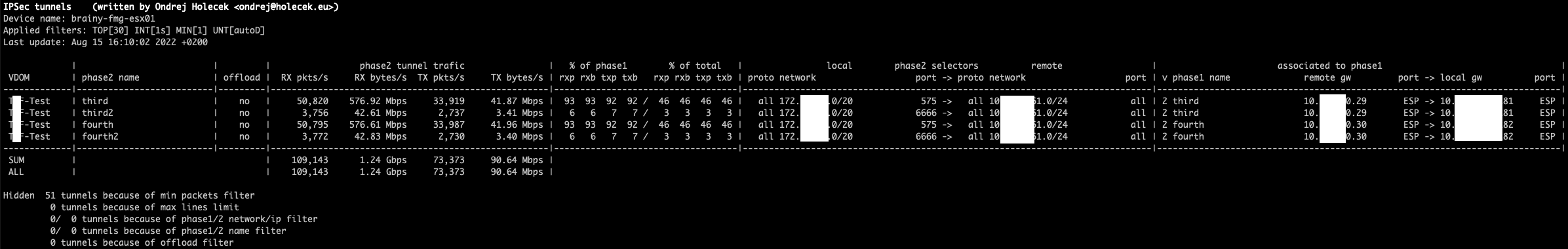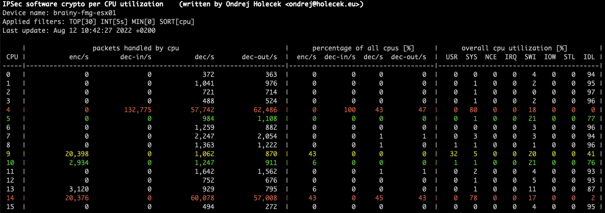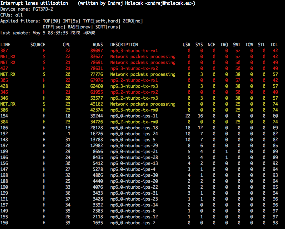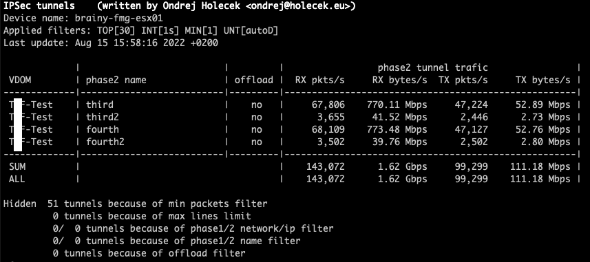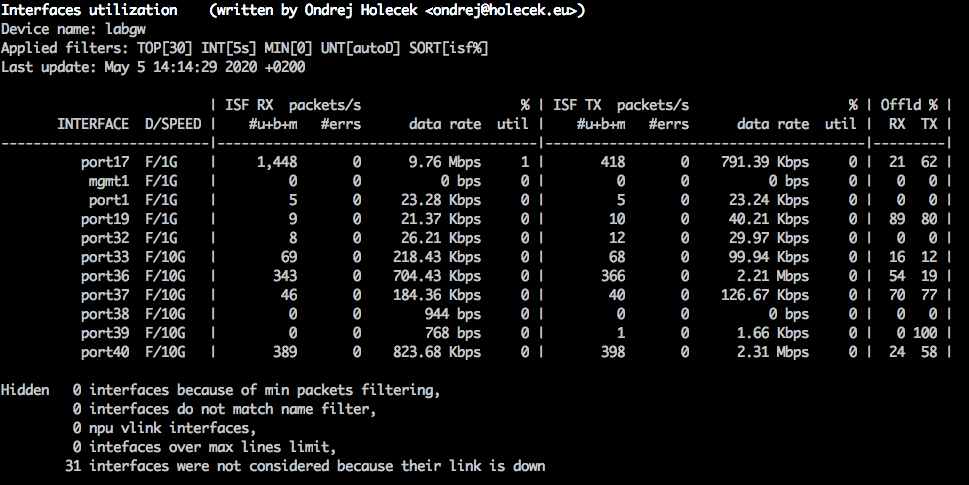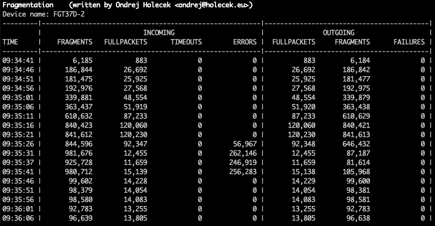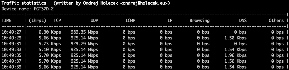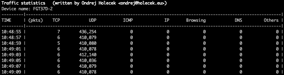 Because of the way how FortiGate creates this statistics, the collection interval should be a multiple of 2. If it is not, the outputs will be very unstable (one line with significantly higher counters, next one with significanly lower counters). Even when using the default interval of 2 seconds, it can sometimes happen that there are no new statitistics generated by FortiGate and the output shows zero or very small numbers on one line.