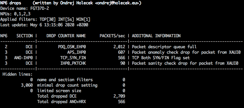 Collects dropped packets from DCE, HRX and anomaly counters for every NP6 in the system. Most of the counters also contain simple description of the packets it drops.