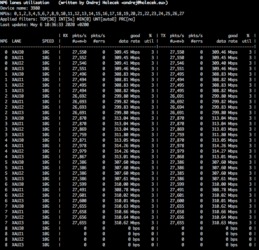 Display utilization of all lanes between all NP6es and ISF (or "front ports" if ISF is not present). In most architectures NP6 is connected to ISF via 4 indepedent 10G lanes and this utility shows the current utilization for each of them.
