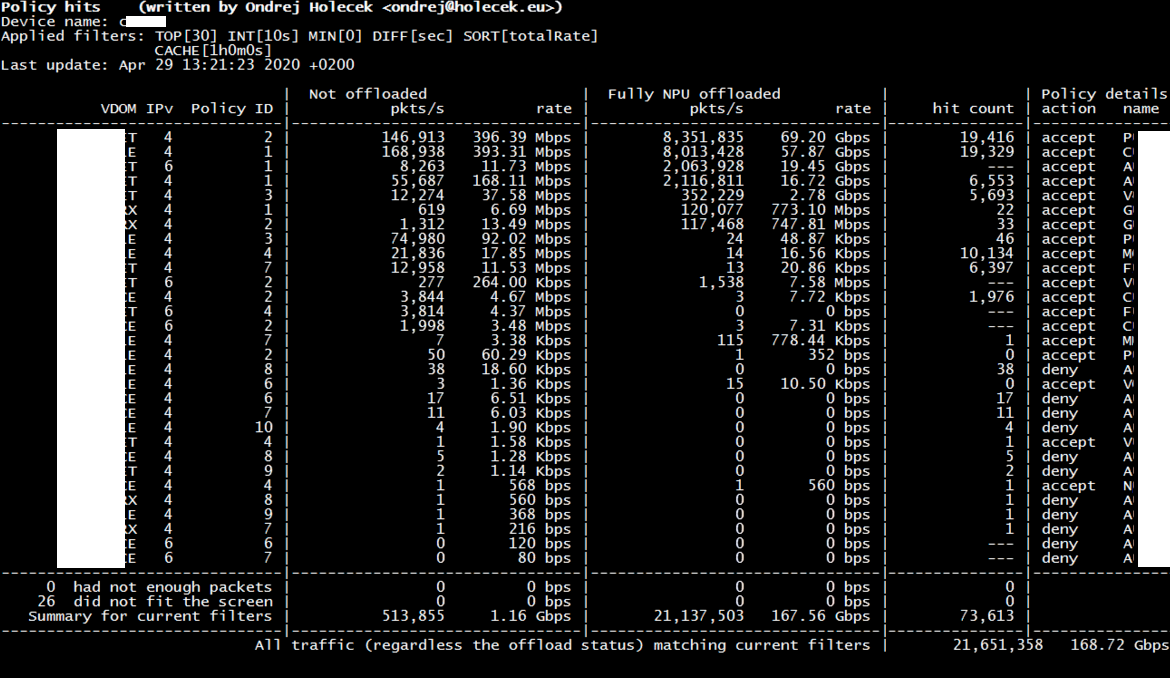 Display the number of packets per second and throughput for each configured policy (IPv4 and IPv6). It also displayes these counters separately for non-offloaded traffic, fully NPU offloaded traffic and traffic that took the path via NTurbo. For each policy it also shows the number of sessions created per second.